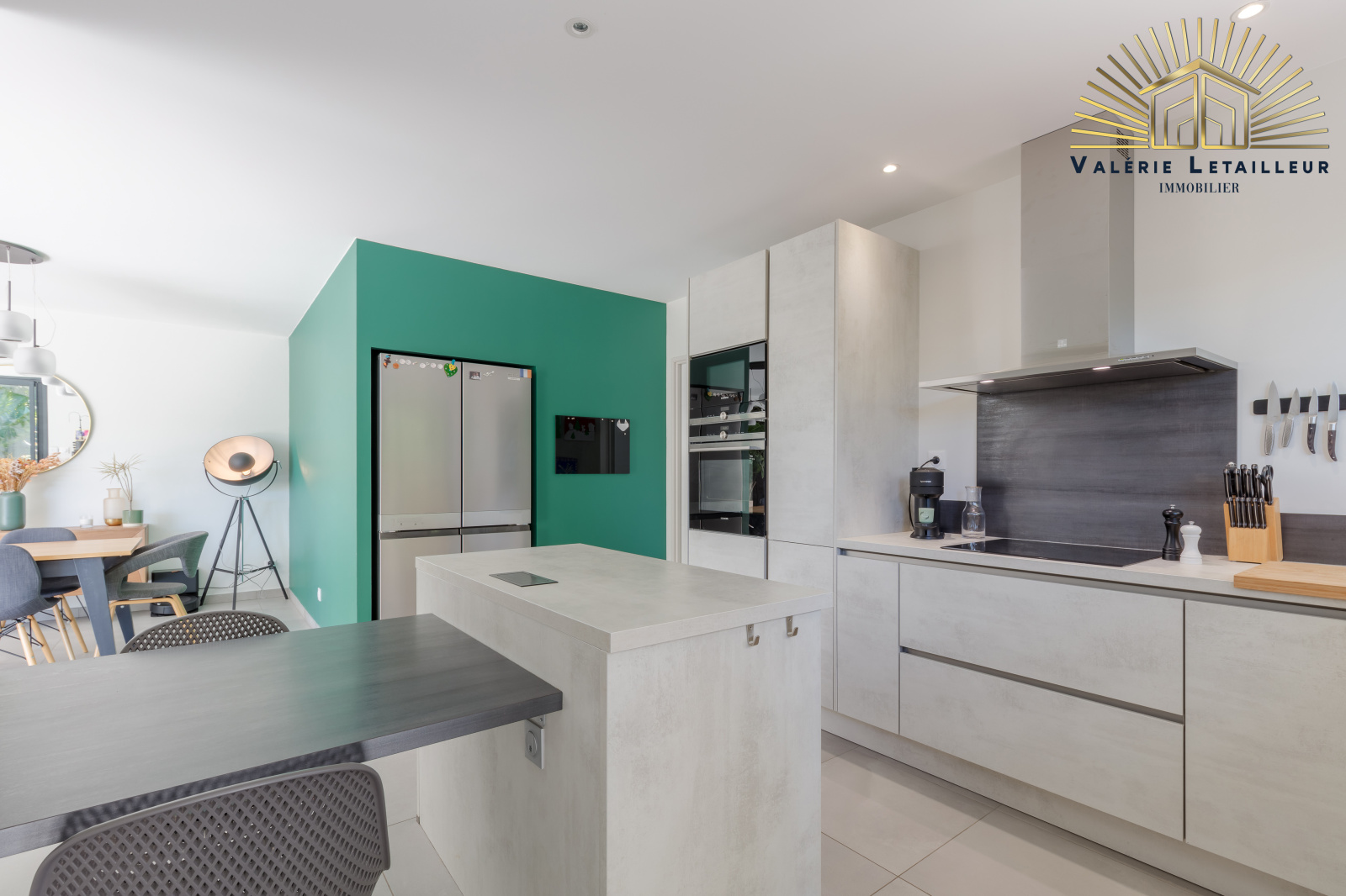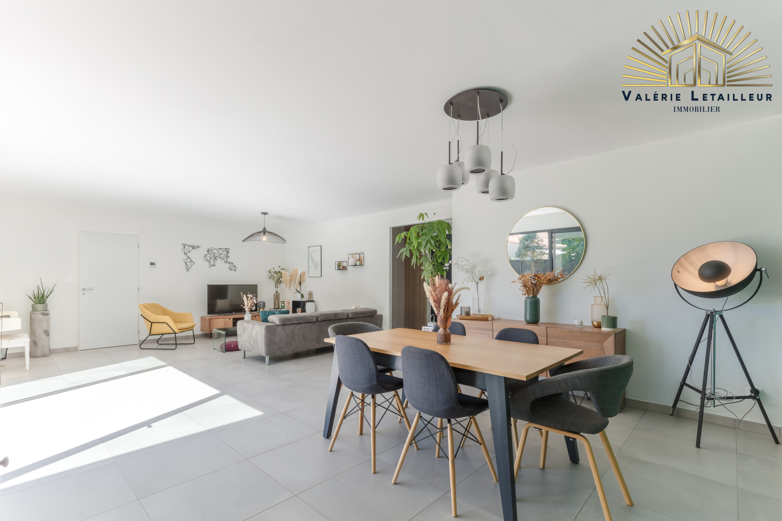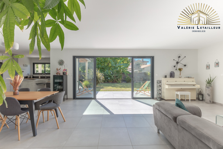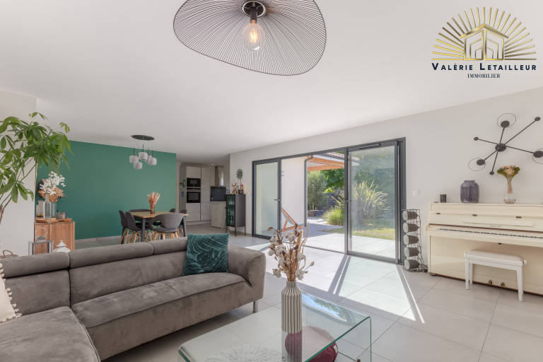 Là, nous serons tout de suite séduit par la pièce de vie lumineuse, qui offre une vue splendide sur le jardin grâce à une grande baie vitrée. Un espace de vie ouvert, très accueillant et spacieux. À gauche, la cuisine ouverte, parfaitement équipée et dotée d’un cellier, s’ouvre sur une terrasse couverte, idéale pour partager des repas en toute convivialité.