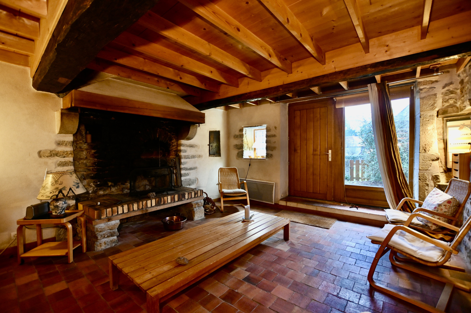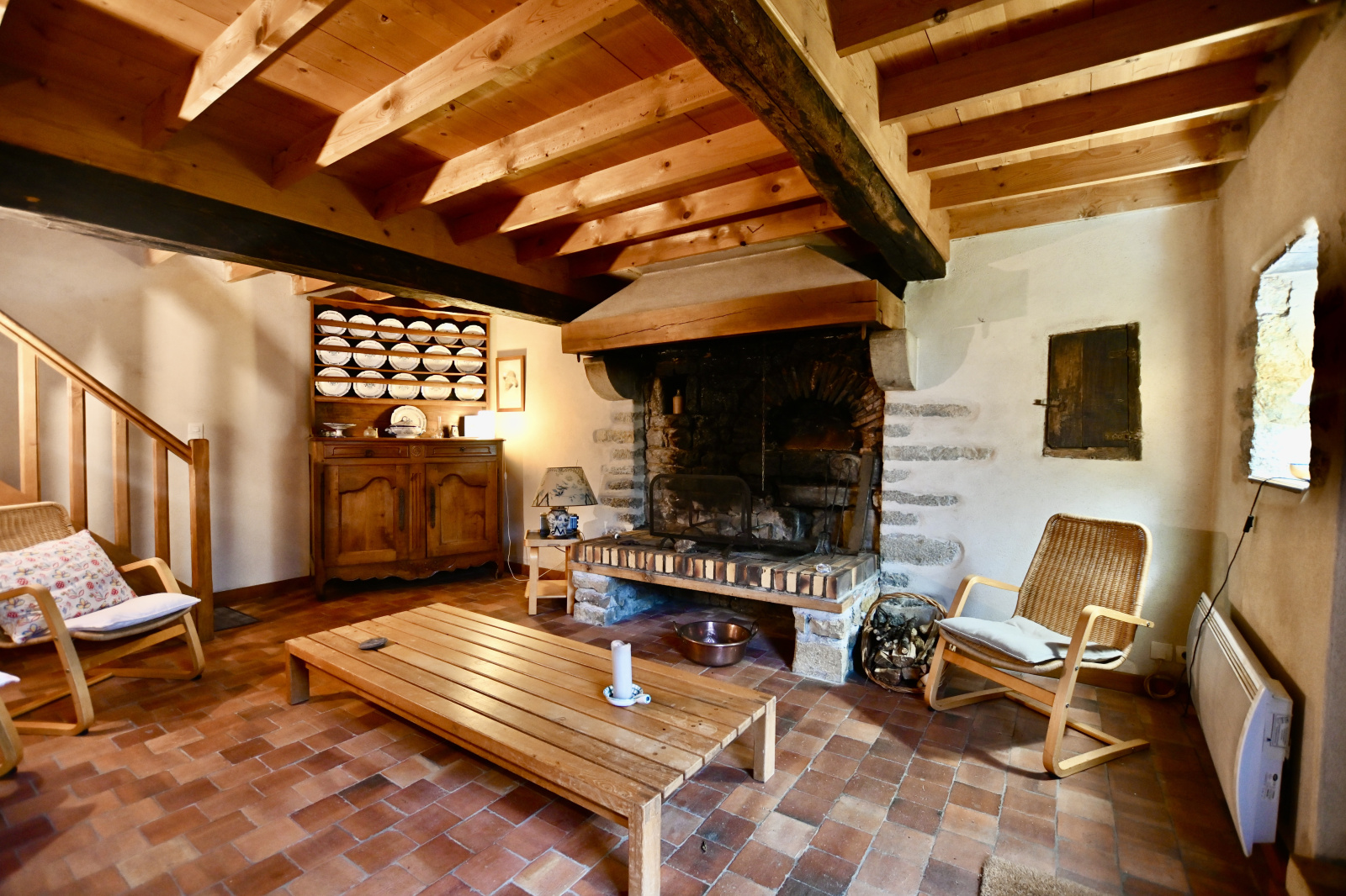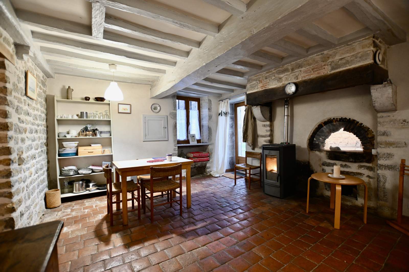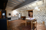 Charmante maison cocooning, comprenant en rez-de-chaussée une entrée sur la cuisine ouverte sur la salle à manger équipée d'un poêle à granule et en déco un four à pain, une salle d'eau et un WC, un salon équipé d'une cheminée à foyer ouvert.