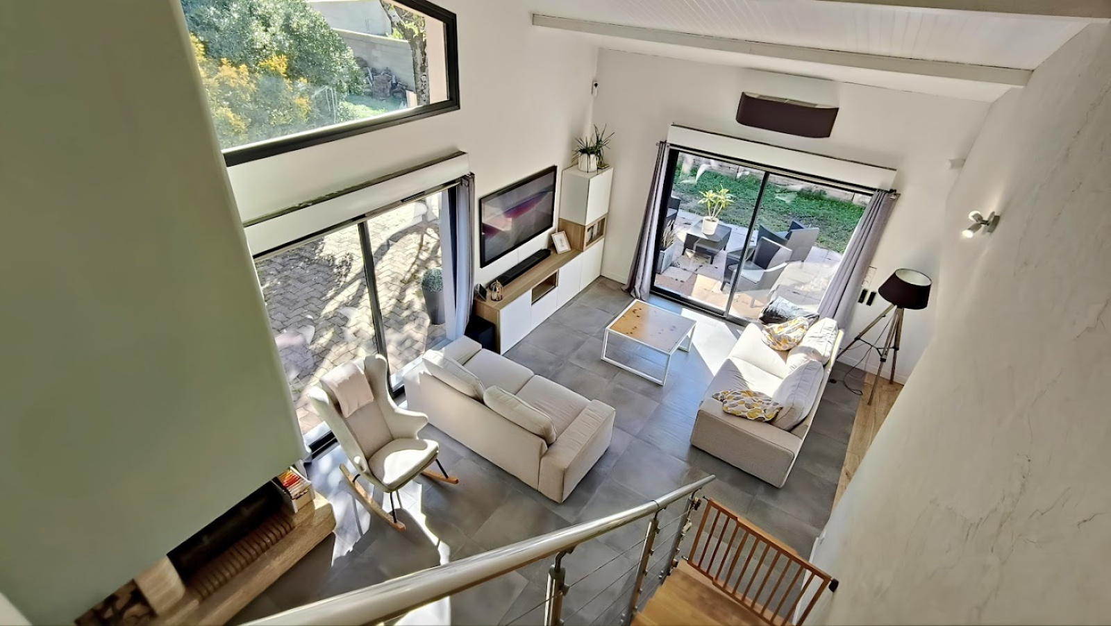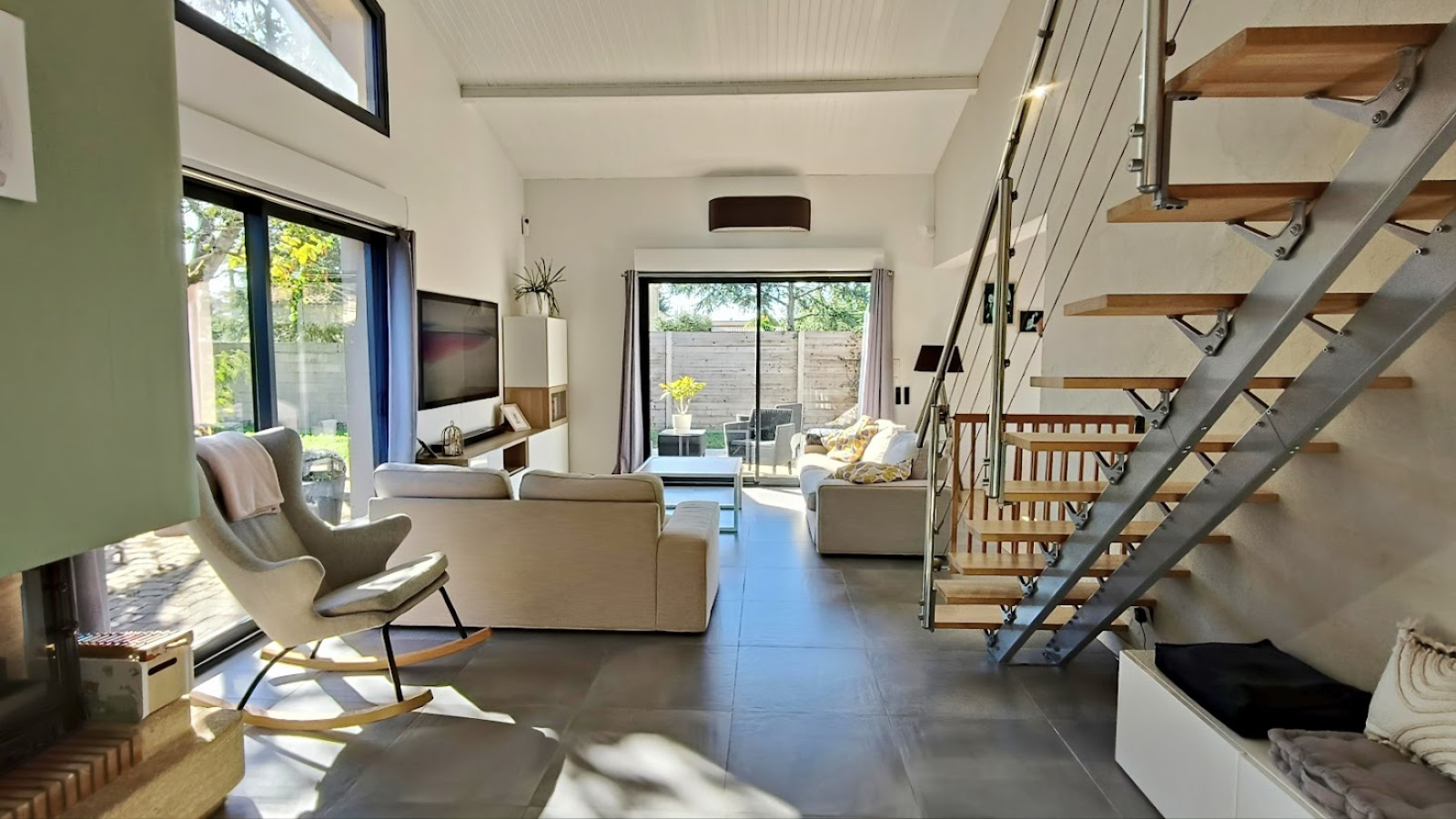 Grand salon traversant avec cheminée et accès direct à une terrasse intimiste