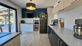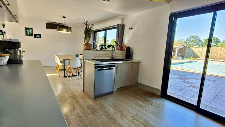 Cuisine moderne, aménagée et entièrement équipée, avec accès direct sur terrasse et piscine