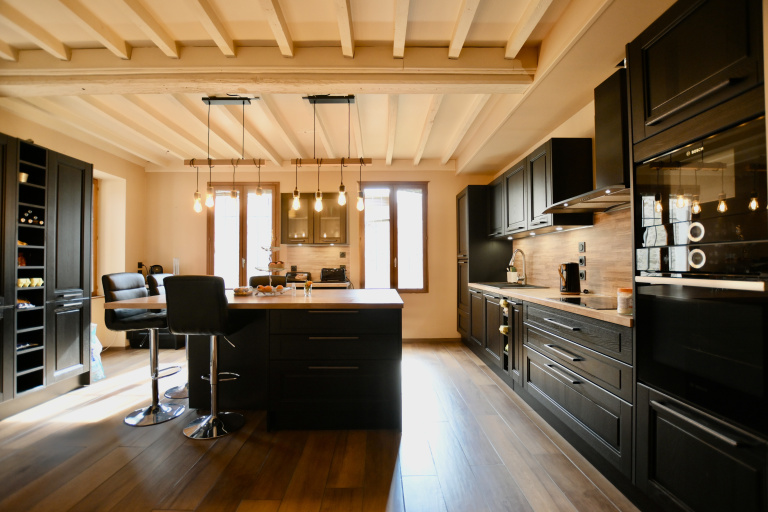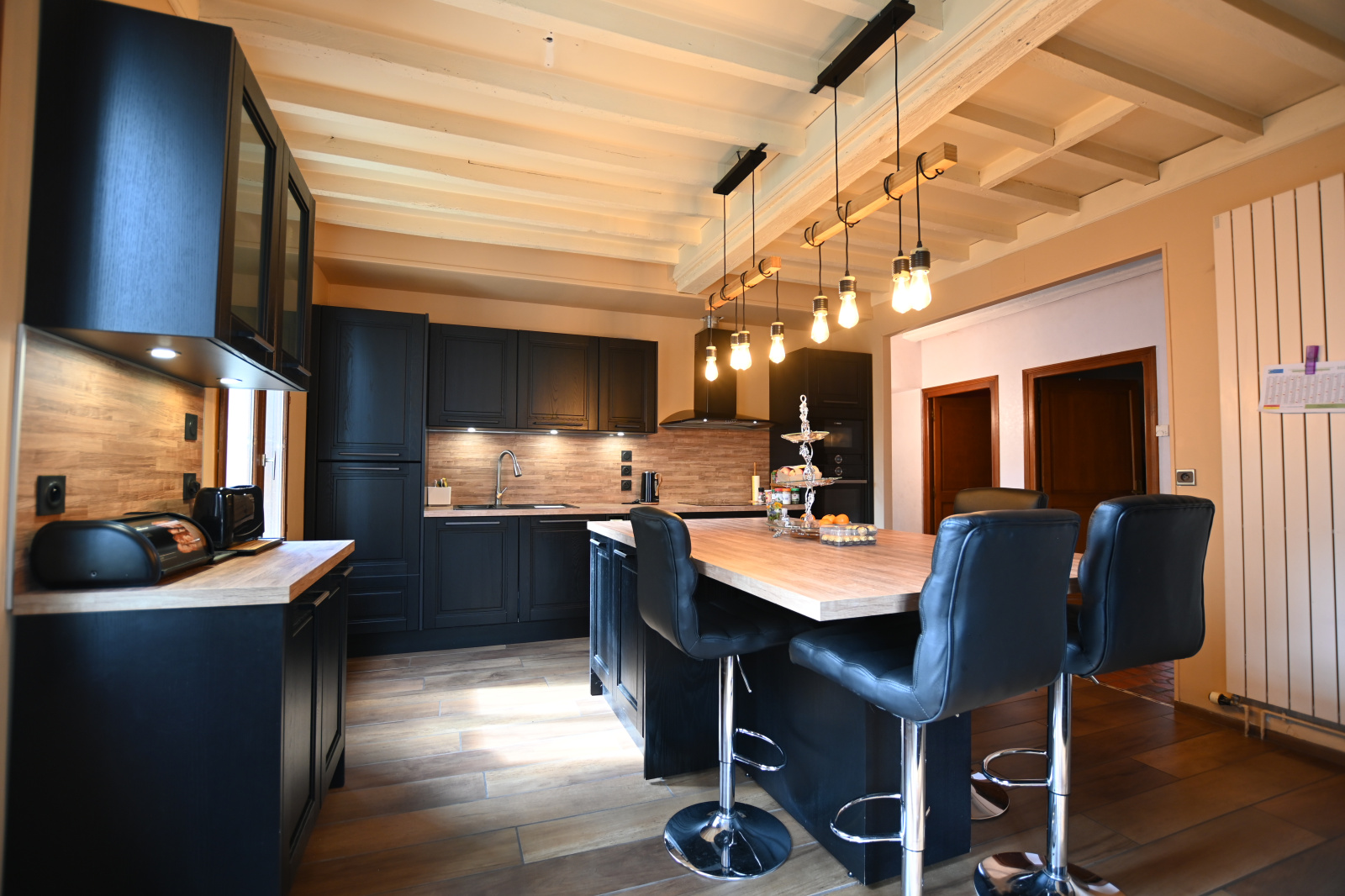 Le rez-de-chaussée comprend un SAS d'entrée, un double séjour équipé d'un poêle à bois, une cuisine dînatoire très récente avec un îlot central pour partager des moments conviviaux, une salle d'eau, un WC indépendant.
