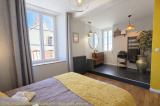 Le salon, distinct du séjour, offre un espace cosy et intimiste. Le séjour/salle à manger impressionne par sa belle hauteur sous plafond, son parquet élégant et sa luminosité. Il s’ouvre sur une cuisine équipée contemporaine, aux lignes épurées et dotée d’équipements de qualité, parfaitement intégrée à l’espace de vie.