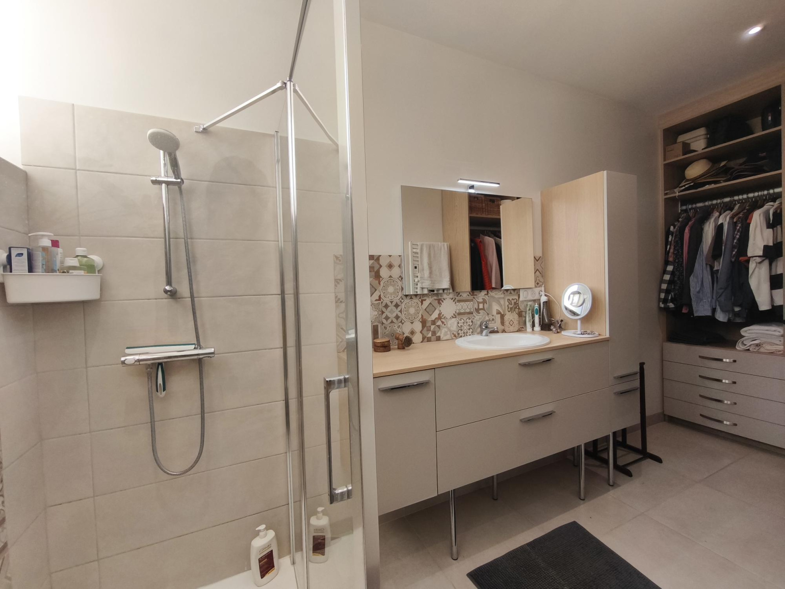 - au rez de chaussée : une pièce en L avec cuisine équipée ouverte sur le séjour, une suite parentale avec chambre/salle de bain.WC et dressing, WC, buanderie.