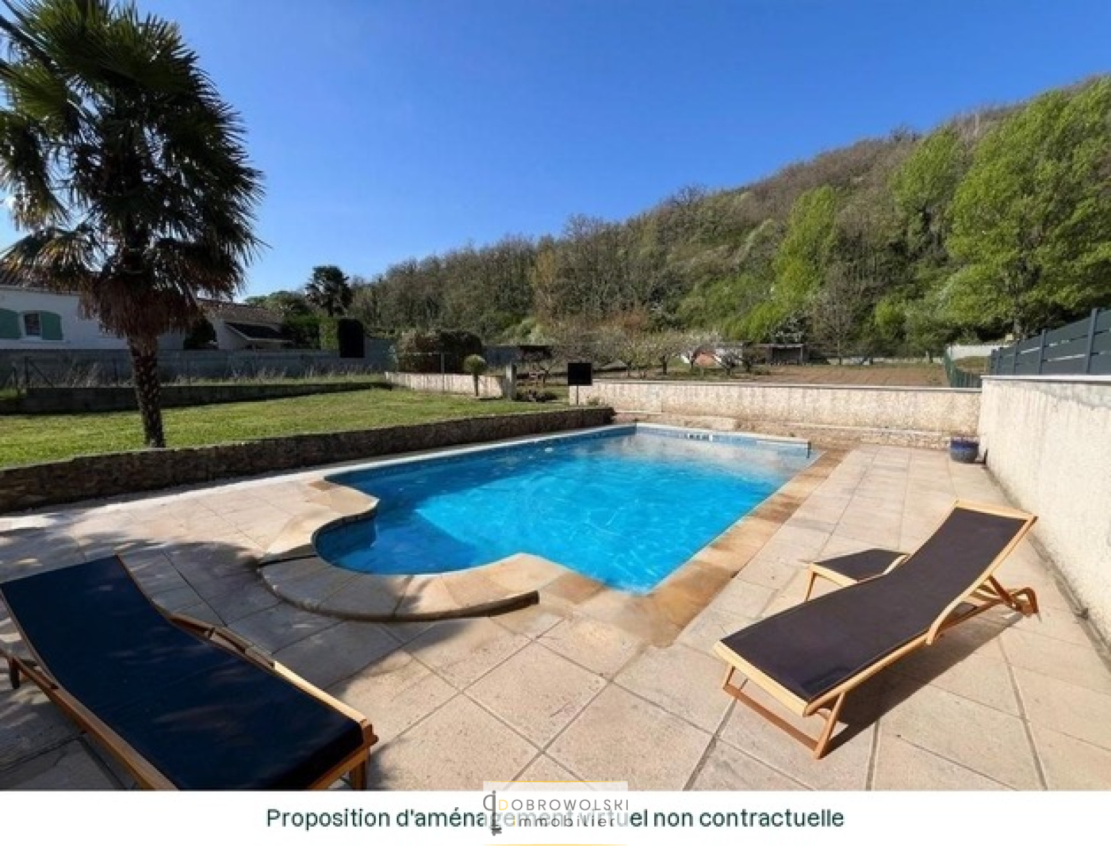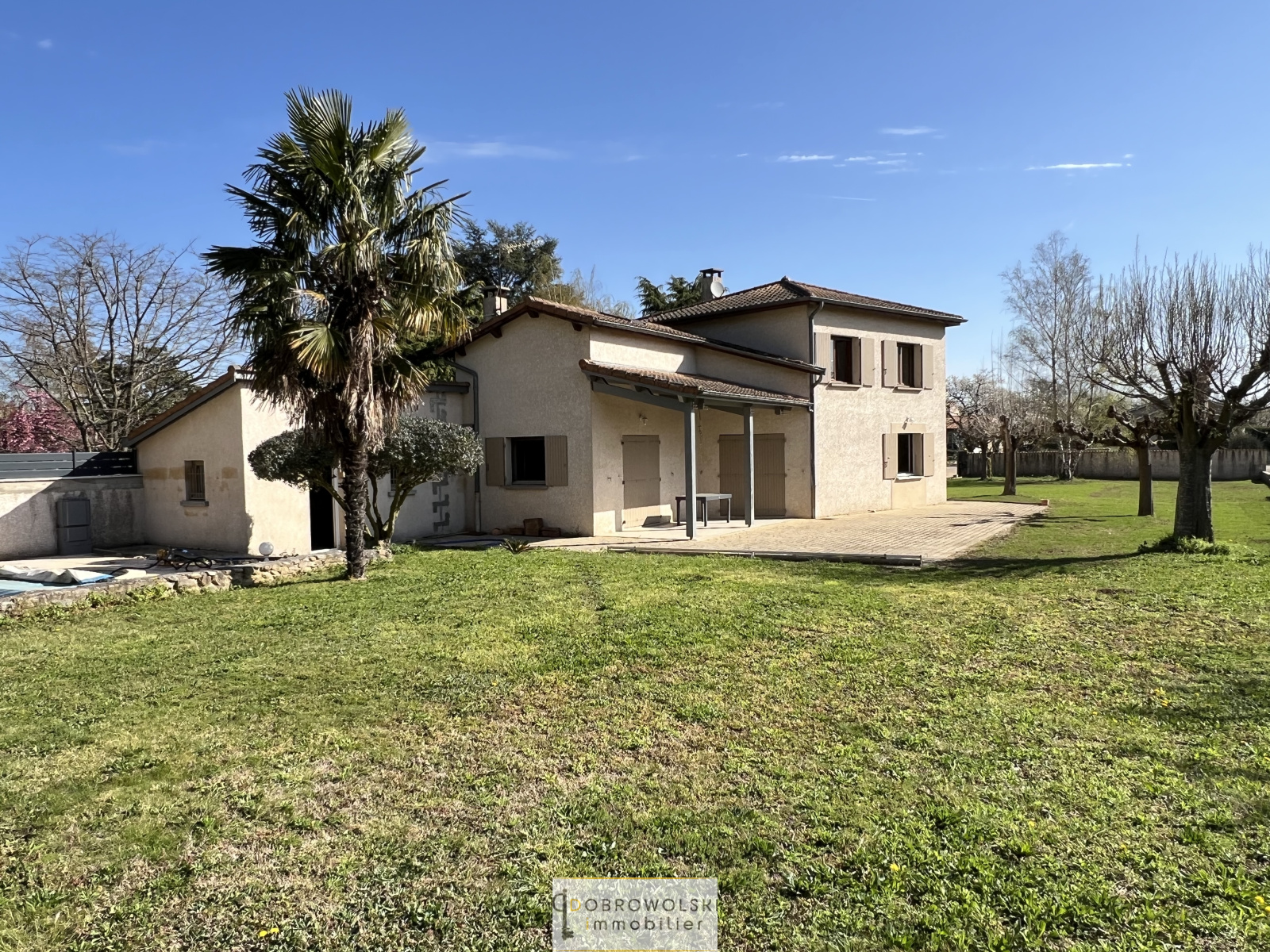 La maison est édifiée sur un terrain plat de plus de 2000m2 agrémenté de sa piscine entièrement rénovée.