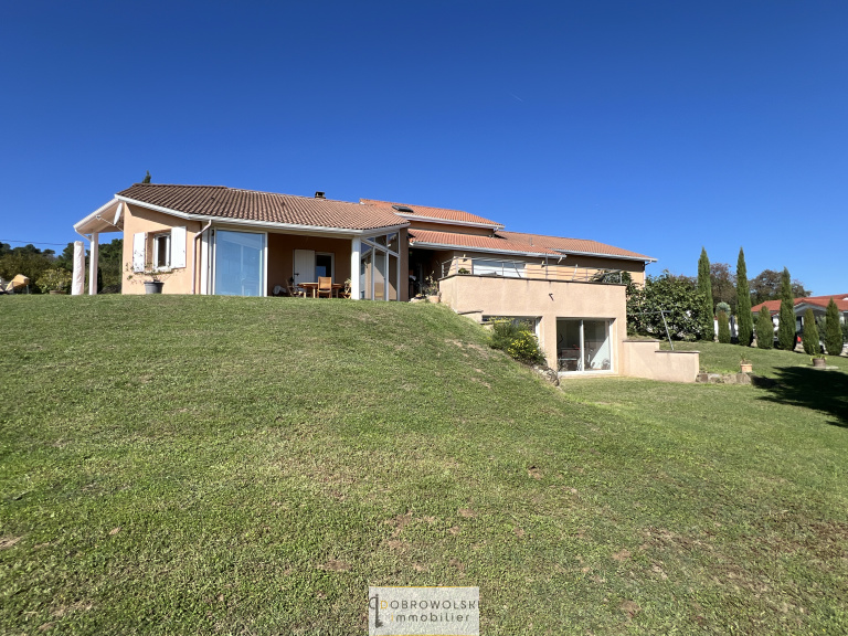 Découvrez cette maison contemporaine dotée d'une identité marquée et peu commune, au charme et aux volumes d'accueil exceptionnels, 209m2 de surface habitable, 40m2 de garage, 2600m2 de terrain. La maison est composée d'une cuisine aménagée et équipée ouverte sur un vaste salon/séjour avec accès à plusieurs terrasses et plusieurs orientations, d'un bureau, de 3 chambres dont 1 parentale équipée d'un vaste dressing et d'une SDE privative, d'une salle de bains, d'une salle de sport équipée également d'une SDE. Les aménagements sont confortables et actuels, vous bénéficierez d'une construction de qualité. La maison profite d'une capacité isolante de bon niveau, les huisseries sont en PVC double vitrage, le chauffage est multiple pour votre plus grand confort : radiateurs électriques, climatisation réversible, poele à bois. Vous profiterez d'un environnement exceptionnel, calme, naturel avec une vue imprenable sur les Alpes, le terrain est clot, végétalisé et accueille une superbe piscine dotée d'un dome pour une utilisation optimisée et confortable une grande partie de l'année. Pour finir et pour faciliter le stockage, la maison est équipée d'un garage double pourvu d'un grenier. Vous l'avez bien compris, il s'agit d'un bien d'exception, n'hésitez pas à me contacter par téléphone pour plus de détails...