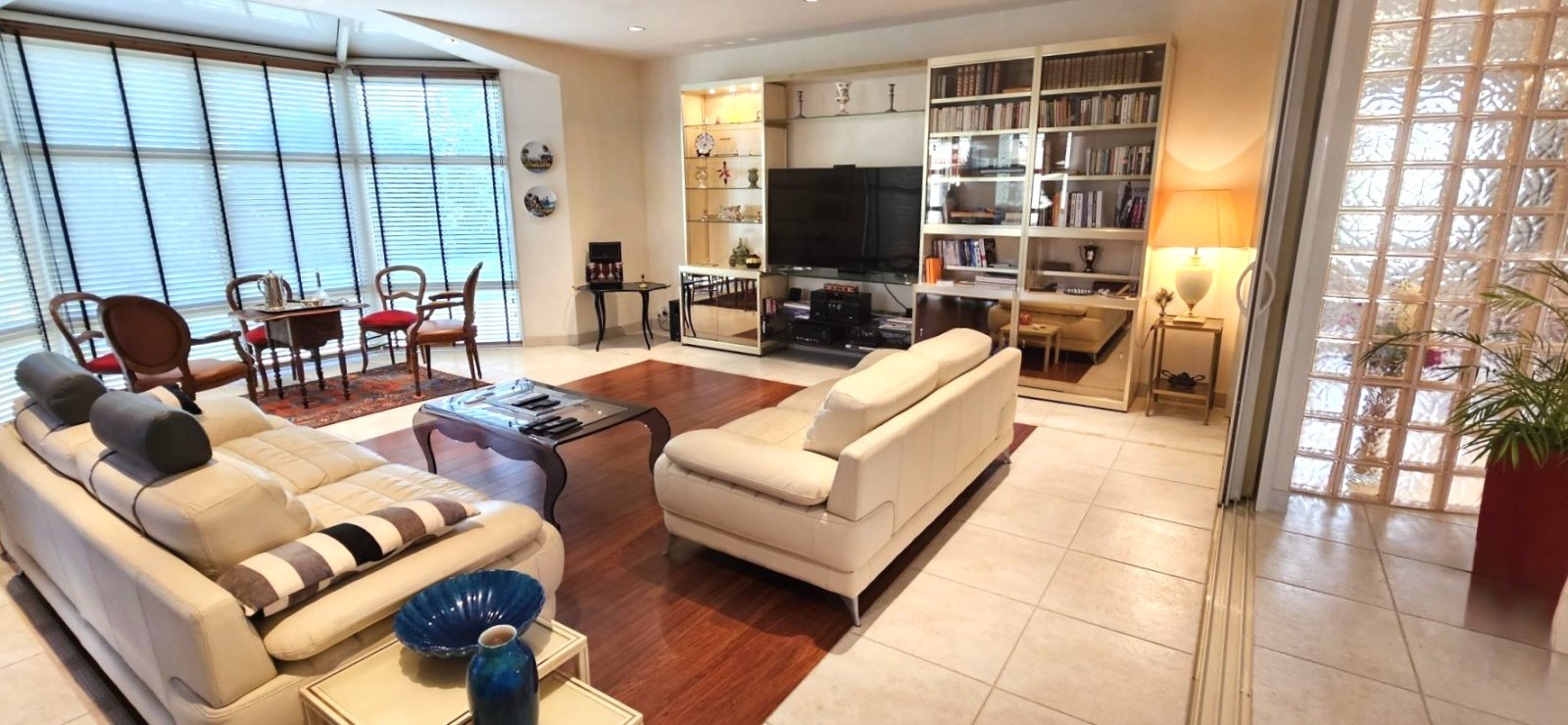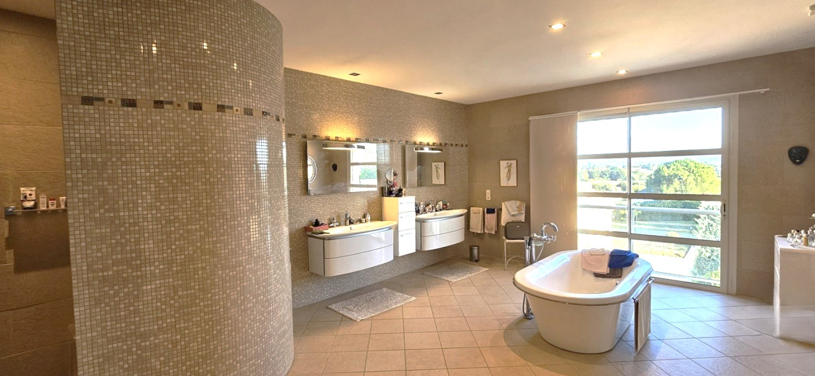 - un espace jour composé de 3 espaces détente, d'une cuisine équipée avec coin repas ouverte sur l'espace salle à manger et salon principal, le tout donnant sur les terrasses extèrieures, un espace buanderie, un espace garage pour plusieurs véhicules de plus de 120 m2, 2 espaces WC