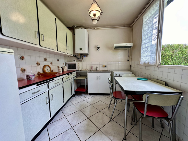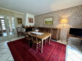 Entrée , cuisine indépendante , séjour double ( environ 30 m2) avec cheminée à foyer ouvert , buanderie , wc avec lave-mains , accès au garage attenant (15 m2) .