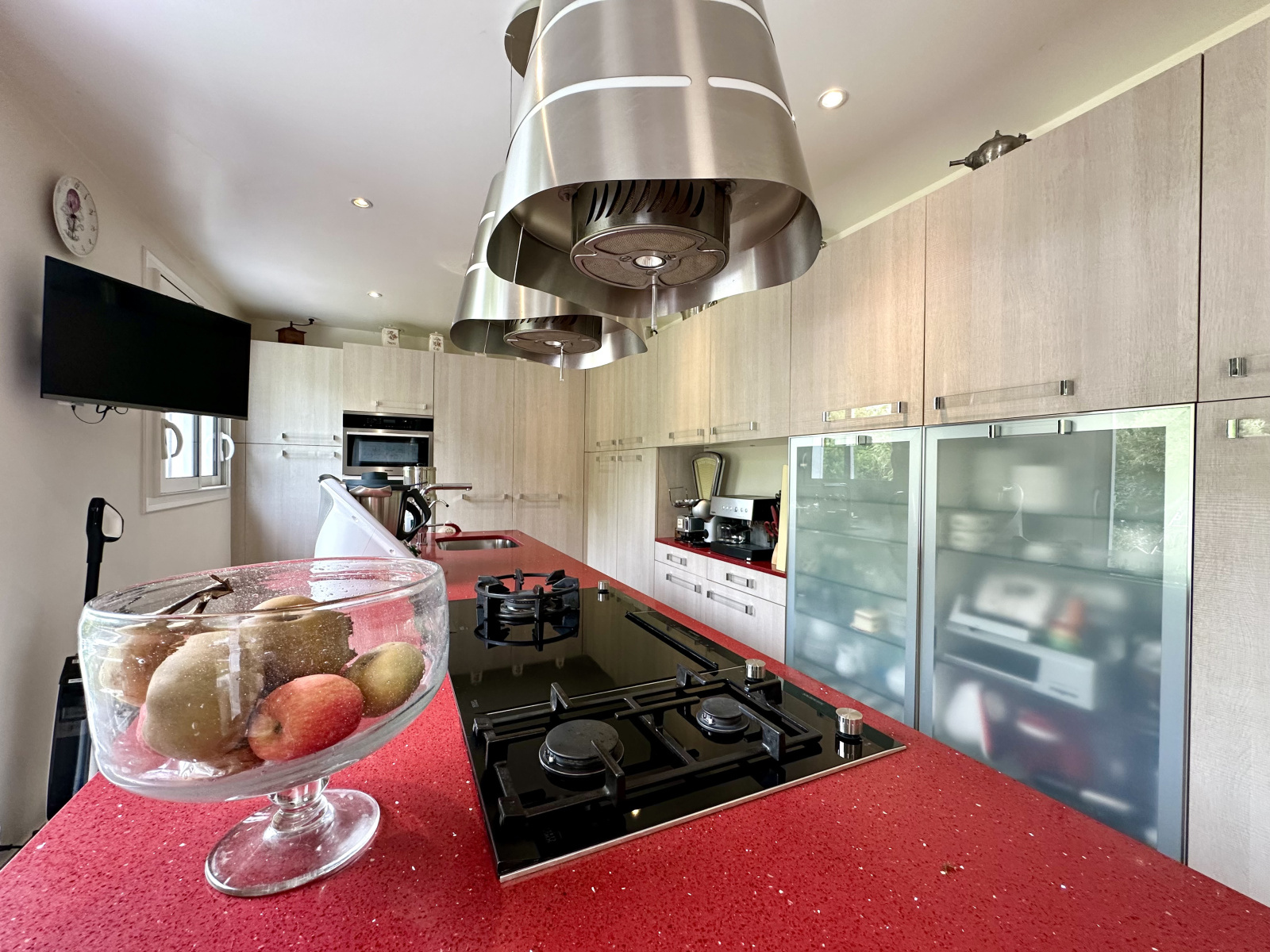 La cuisine moderne , aménagée et équipée avec des materiaux de qualité , s'ouvre sur une jolie terrasse avec une vue dégagée sur le jardin arboré et fleuri.