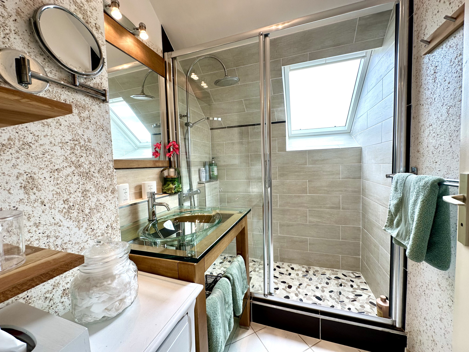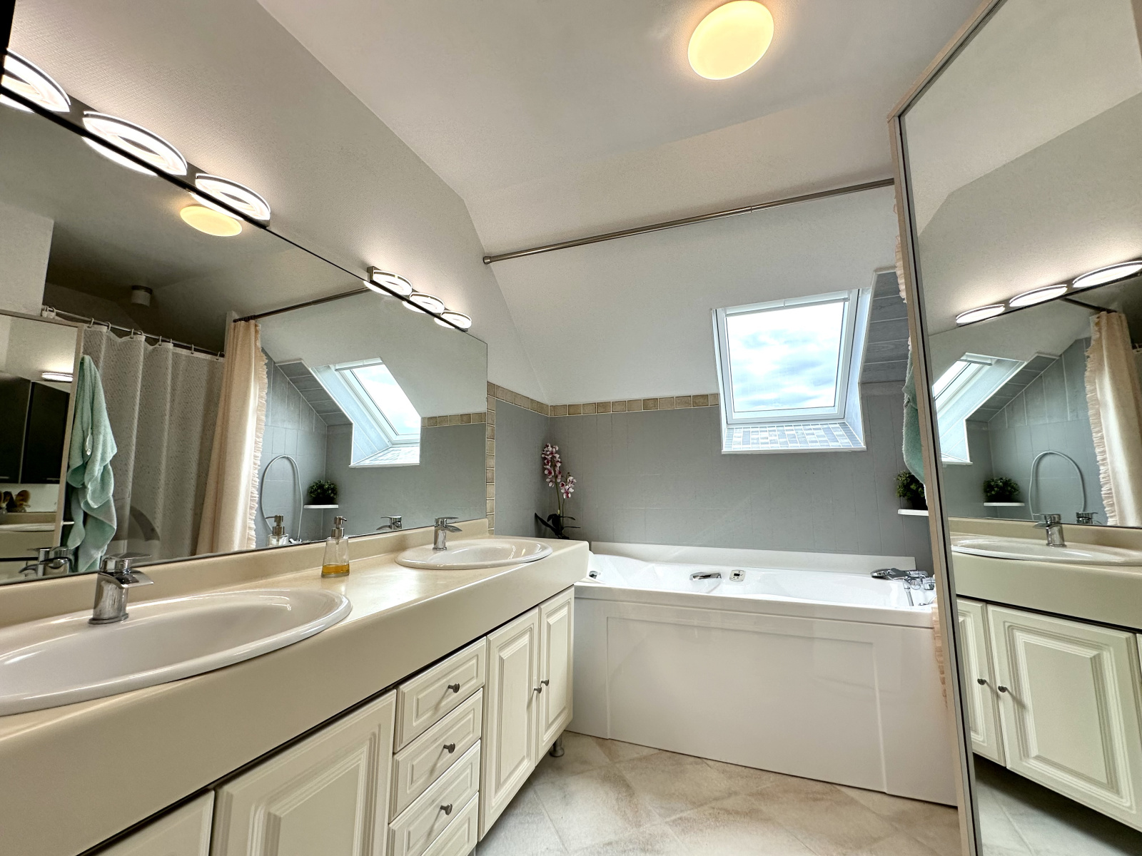 A l'étage , le palier dessert 3 belles chambres : une suite parentale de 25 m2 avec sa salle de bains privative / wc , et deux autres chambres dont une avec balcon , une salle d'eau récente et un wc séparé.