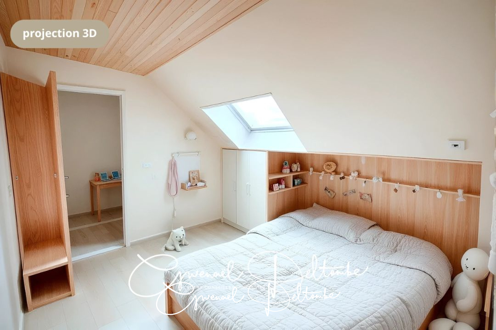 L’étage dispose de deux chambres confortables ainsi qu’une salle d’eau équipée d’un sani-broyeur. Au deuxième et dernier étage, deux chambres supplémentaires viennent prolonger l’espace nuit, accompagnées d’un petit grenier idéal pour le rangement ou pour aménager un espace ludique.