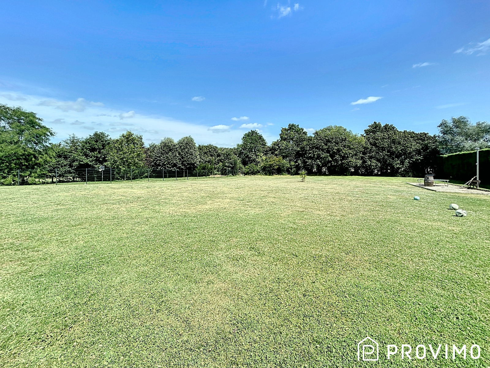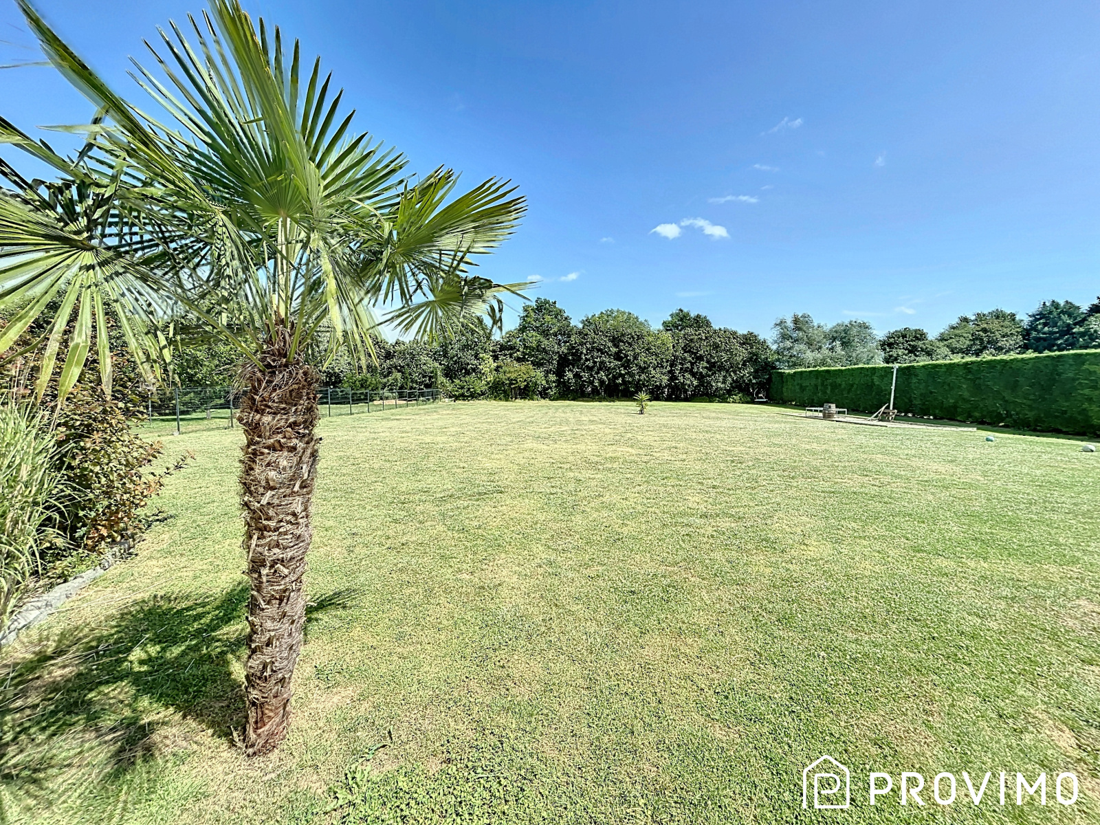 Le terrain arboré bénéficie d'un calme absolu sans vis à vis, une terrasse de 80m2 et un terrain de pétanque sont à votre dispositon.