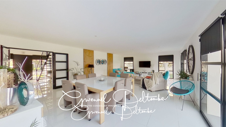 Dès l’entrée, le ton est donné : un hall spacieux avec dressing vous accueille et ouvre sur une pièce de vie lumineuse de près de 60 m², grâce à ses larges baies vitrées. La cuisine familiale de 33 m², entièrement équipée, devient un véritable lieu de convivialité avec son espace dinatoire. Un cellier, un bureau, une buanderie et un garage de 60 m² complètent le rez-de-chaussée.