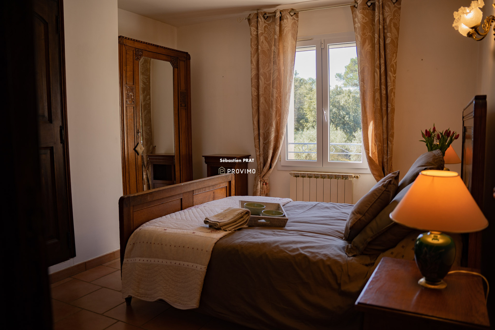 La bastide se compose au rez-de-chaussée, d'un hall d’entrée, d'un grand séjour avec une cheminée équipée d’un insert, d'une cuisine ouverte attenante équipée, d'une salle d’eau avec wc, d'un dressing, d'un cellier, d'une buanderie. Une cuisine d’été avec cheminée sur terrasse couverte offre un espace convival par toute saison. À l’étage, se trouvent quatre chambres dont une suite parentale, une salle d’eau, et un wc indépendant.