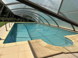 Vous profiterez d'une grande piscine traditionnelle (11m x 5,5m) avec revêtement en mosaïque, sécurisée par un abri rigide amovible garantissant la sécurité des enfants et permettant une utilisation prolongée durant l'année.