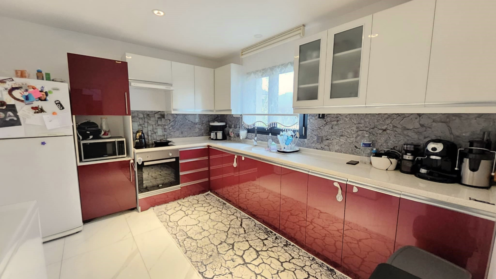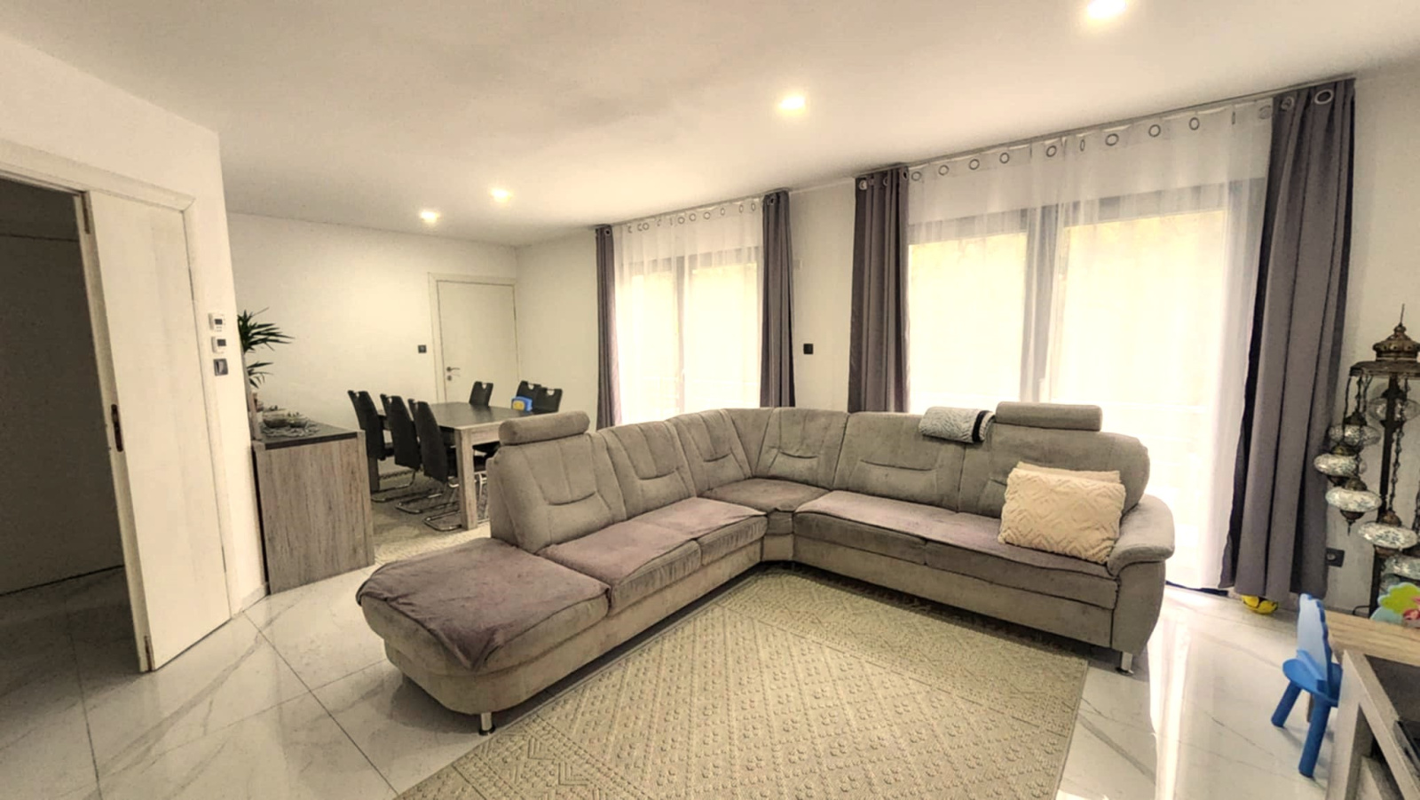 Ce bien vous offre une cuisine équipée donnant sur une salle de vie ouverte, 3 chambres, une salle de bain, 2 toilettes et un garage.