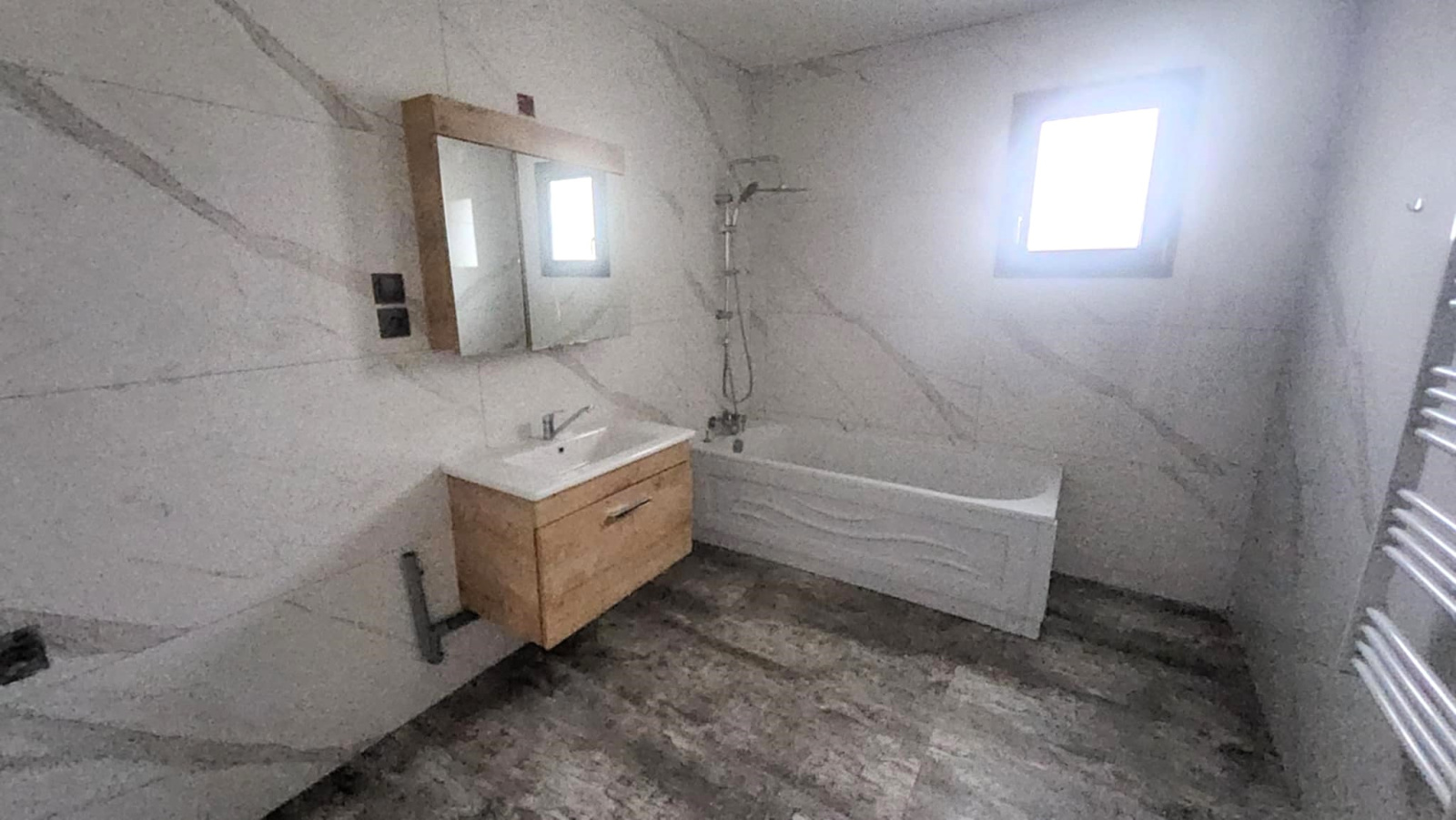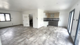 Ce bien vous offre une cuisine équipée donnant sur une salle de vie ouverte, 3 chambres, une salle de bain, 2 toilettes et un garage.