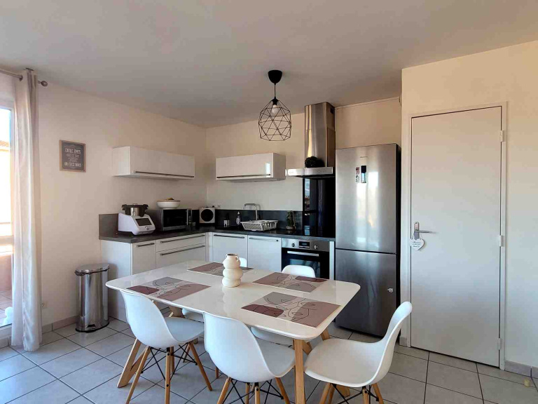 L'appartement offre une surface habitable d'environ 58 m² et comprend une entrée desservant un séjour avec cuisine équipée donnant accès à une belle terrasse, deux grandes chambres avec placard, une salle de bains entièrement refaite et un WC indépendant.