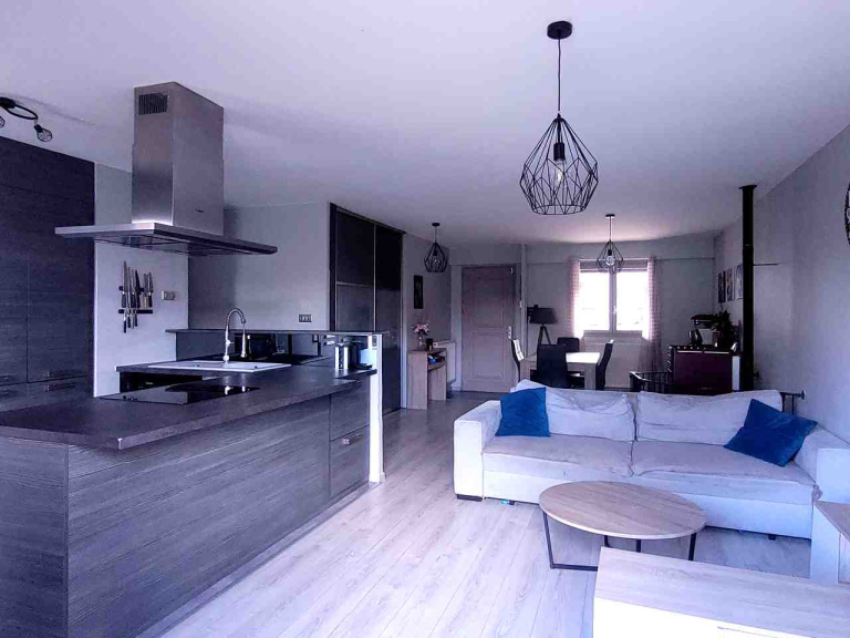 En entrant, vous trouverez une vaste pièce de vie traversante avec cuisine ouverte équipée, un dégagement desservant trois grandes chambres avec placard, une salle de bain et un WC indépendant.
