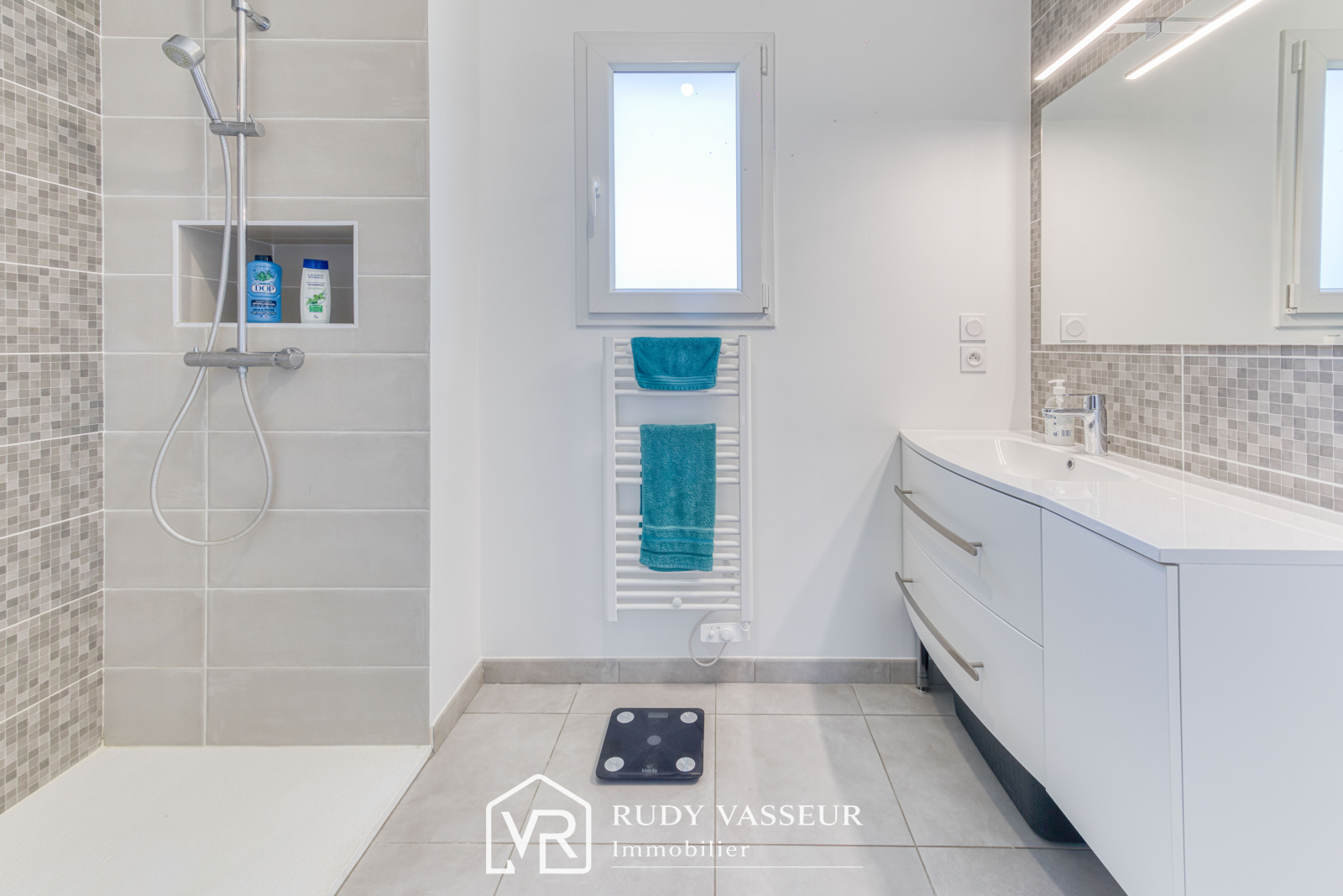 Le rez-de-chaussée comprend une vaste pièce de vie de 51 m² avec cuisine ouverte entièrement équipée, prolongée par une terrasse couverte idéale pour les moments de convivialité. Une chambre avec dressing, une salle d’eau, un bureau aménagé, un WC indépendant ainsi qu’un double garage de 40 m² complètent ce niveau.