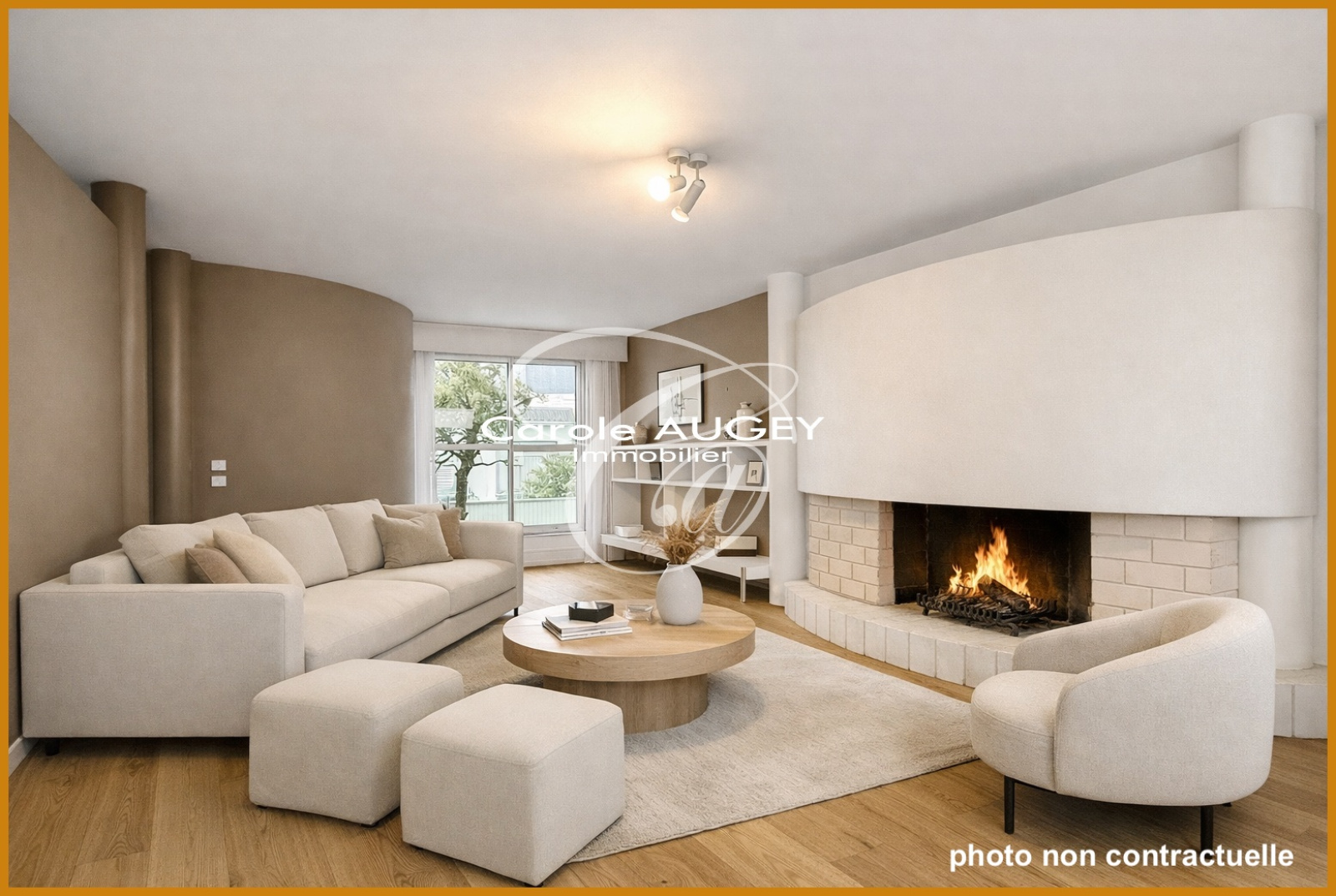 Dès l’entrée, on perçoit le style des années 80-90, qui pourra être subtilement modernisé par quelques touches de peinture et une décoration plus actuelle. Puis la magie opère. Le séjour de 47 m² se déploie face au jardin, souligné par une élégante cheminée en arc de cercle. Un véritable parti pris architectural.